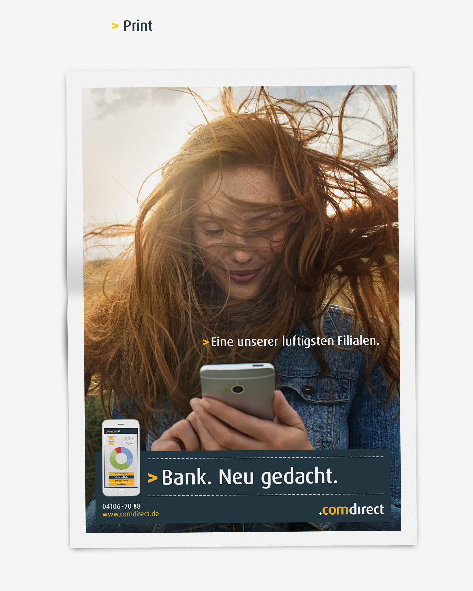 Die Bankwelt hat sich verändert. Der Bankkunde auch. Höchste Zeit, dass auch die Bank selbst sich neu erfindet. Unser neuer Markenauftritt für die comdirect zeigt, wie das funktioniert. Mit einer ungesehenen Inszenierung, weit weg von Produktwerbung und Schlange stehen am Schalter. Und mit einer klaren Botschaft: Immer für dich da, wann und wo du willst. Genau so, wie sich Kunden eine moderne Direktbank wünschen: unabhängig und flexibel wie sie selbst.